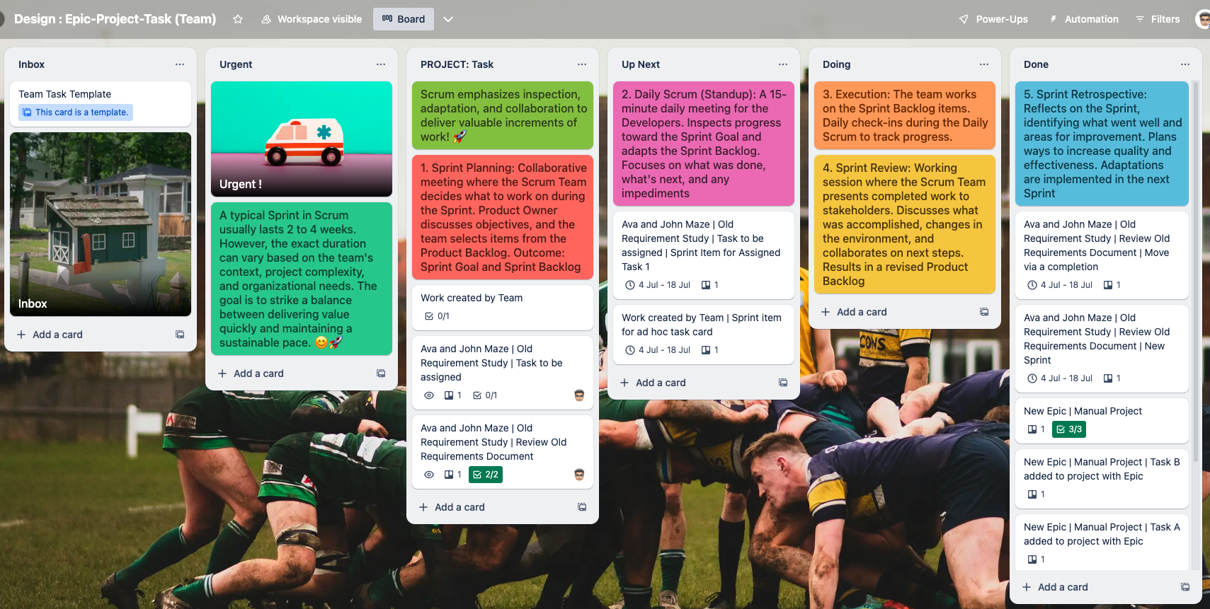 With Trello automation this can be easily achieved with a scrum master assigned and team member(s) assigned to Sprint items with an expected due date for the expected completion of the work item. Scrum emphasizes inspection, adaptation, and collaboration to deliver valuable increments of work! š