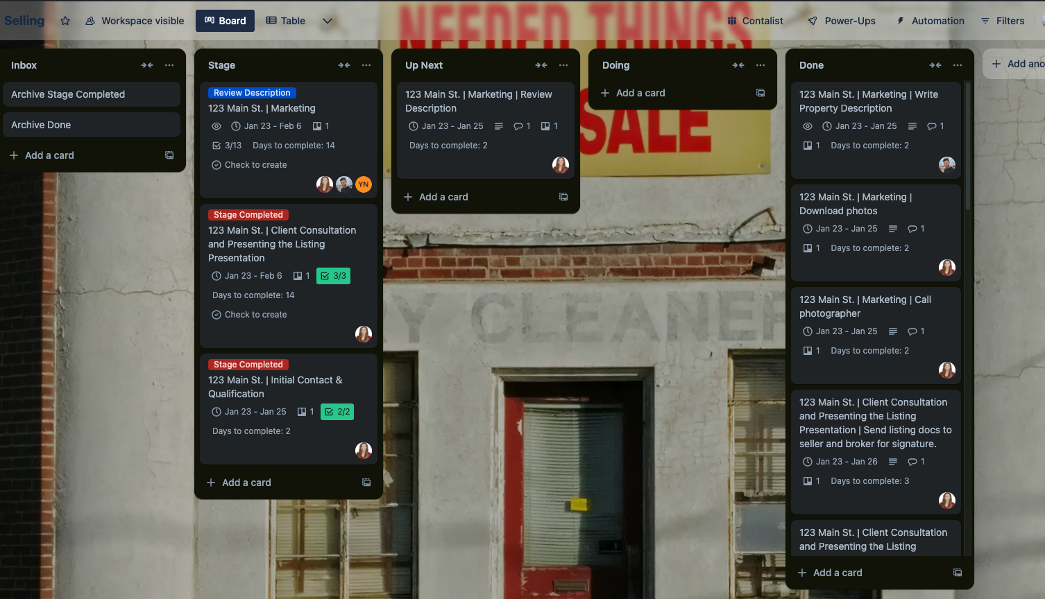Status Reporting: When a "Stage Completed" label is added, the status is reported back to the Real Estate Sales Daily board.
